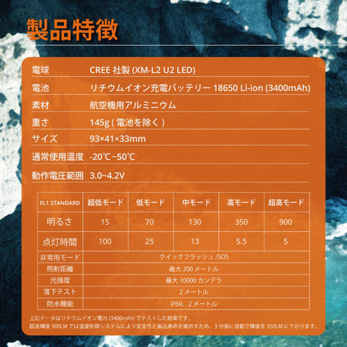 | 明るさ(5段階) | 900~15ルーメン |