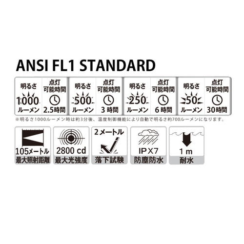・明るさ1000ルーメン(2.5時間) 500ルーメン(3時間) 250ルーメン(6時間) 50ルーメン(30時間)