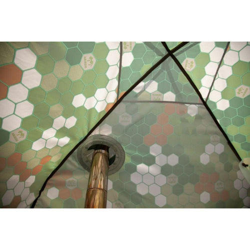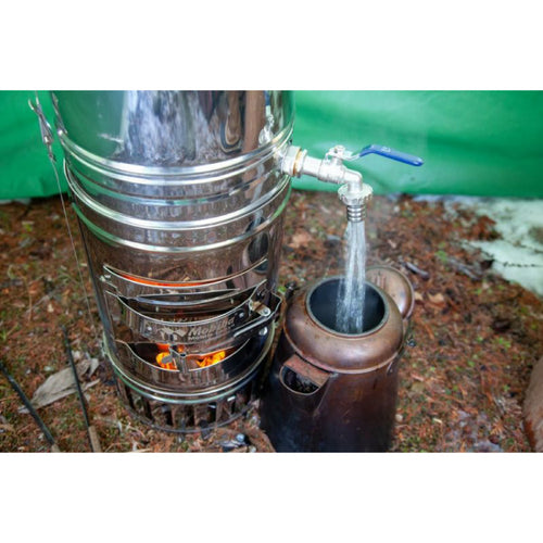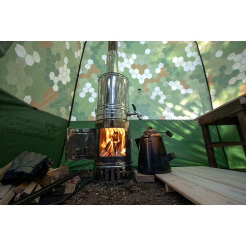 ストーブの扉には、炉へ常に燃焼空気を供給するための、開放された2つの丸い給気口があります。タンク内の水は炉と煙突の熱を受けて沸騰し、発生した蒸気は煙突の一部でもある蒸気過熱器に導かれます。蒸気過熱器の内部は、煙を排出する煙突の役割に加え、水蒸気だけを通す蒸気管があり、高温水蒸気を効率よく排出します。また、蒸気整流板により、テント内の上部はもちろん、側部、下部まで蒸気が均一に行き渡ります。