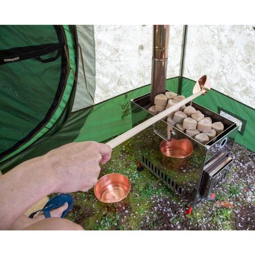 ひしゃく側面の3つの穴から水が美しく流れ落ち、最適な水量が心地よい音とともにサウナストーンに当たります。
