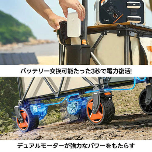 電力が切れても、たった3秒でバッテリーを交換して電力復活。U20バッテリー1個付きで、荷重60kgの状態で約3.4kmまで走行可能。