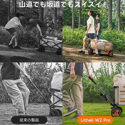 新採用の広幅ワイドタイヤにより、抜群の安定性を実現。荷物運搬時のストレスを大幅に軽減し、使い勝手が向上しました。草地や舗装路、砂利道はもちろん、砂浜でもスムーズな移動が可能。凸凹道や傾斜地でも安心して使用できます。