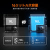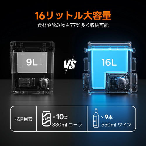16Lの大容量で、330ml缶10本または500mlボトル9本を収納可能。2Lのペットボトルも余裕で収納できます。家族や友人とのキャンプやアウトドアでの利用にも十分な収納力があり、あらゆるシーンで活躍します。また、ポータブル冷蔵庫として、大容量ながらもコンパクトな縦型設計で、車内でも場所を取らず効率的に収納できます。