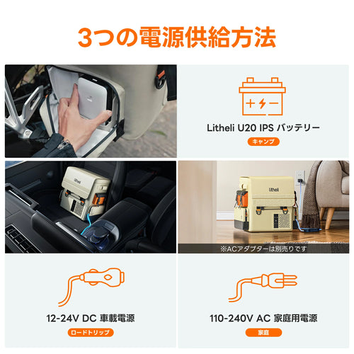 Litheli冷蔵庫は、交換式の大容量バッテリーに加え、12V/24V DC車載電源と100V-240VのAC家庭用電源に対応できます。キャンプでも自宅でも、シームレスに利用でき、特に長時間の移動や車中泊での使用に最適です。バッテリーの交換が可能なため、長時間の使用も安心です。