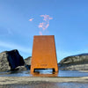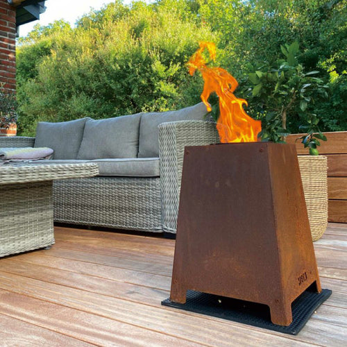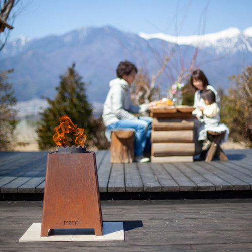 味わい深いサビ色と炎の演出で、庭やデッキのくつろぎスペースの雰囲気づくりに最適です。