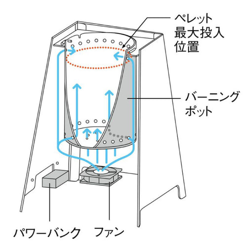 ファンが回ることでバーニングポットの底面と側面から燃焼用の空気がコンスタントに供給され、安定した燃焼が得られます。