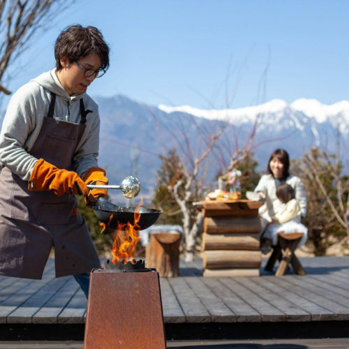 ゆらめく炎を眺めながらのんびりするもよし、調理を楽しむもよし。いろいろに遊べるペレットバーナーです。