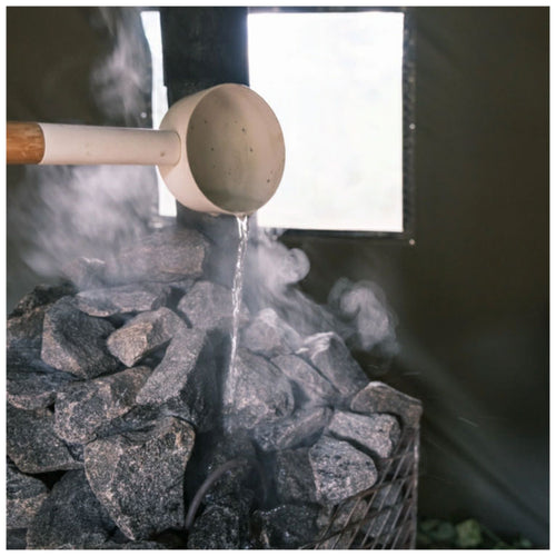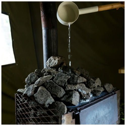 4.ロウリュを開始する際は、はじめは少量の水をサウナストーンにかけ、蒸気が発生する様子で熱せられていることを確認してから、ロウリュを開始してください。