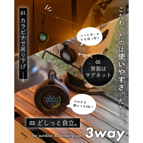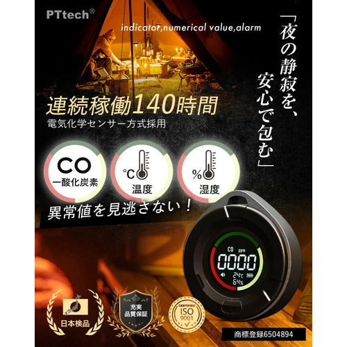 大音量の警報音、濃度レベルを色で知らせるLCDディスプレイ、数値の3段構成で一酸化炭素の危険度をお知らせします。また、何かと便利な温度、湿度計つきです。
