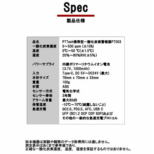 一酸化炭素濃度、50ppm以上を感知すると警報音が鳴ります。(こちらの値は用途に合わせて変更が可能です。)