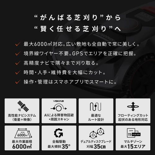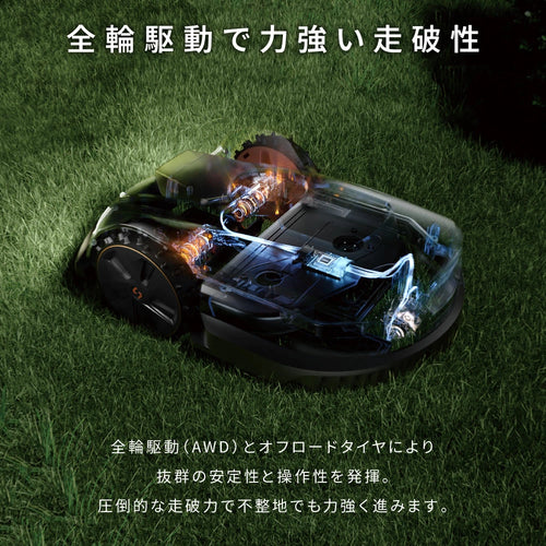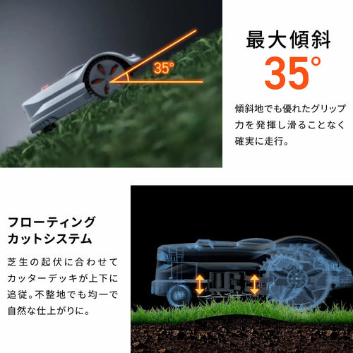 AONavi™ナビゲーション、Vision AI、2枚のディスクブレードにより、起伏や障害物にも柔軟に対応します。最大35度の斜面も全輪駆動でスムーズに走行。