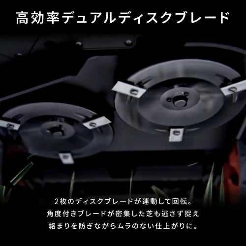 ・デュアルディスクブレード採用、刈幅35cmで広範囲を効率的にカット。