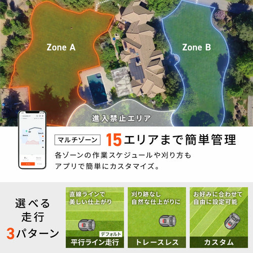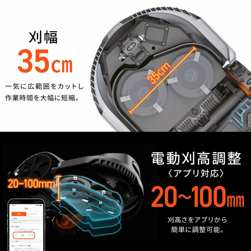 ・電動刈高20〜100mmと最大15エリア管理で大規模エリアを自在に運用。