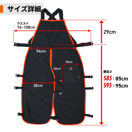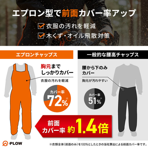 ウエスト調節可能でポティの前面を広くカバー・汚れにも強いエプロンスタイルのチャップスです。エプロン型で服への汚れを抑えて、ストレッチ素材で動きやすく汗をかいても蒸れず快適さをキープ。万一のとき内部の防護材がチェンソーのチェーンに絡みつき動きを停止します。