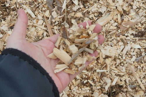 粉砕された枝や木材はこんなに細かく粉砕。枝木のゴミをコンパクトに処理できるだけでなく、ストーブの焚き付けや畑の肥料などにも用途は広がります。