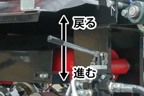 ロングログローダーの油圧式レバー。前進と後進が一つのレバーで行えるのが特徴。レバーが軽いので少ない力で作業が行える。