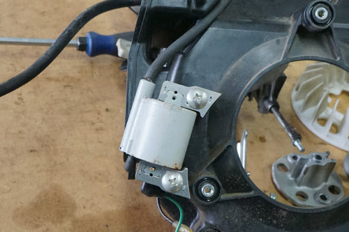 カバーを外した状態で点火コイルの他プラグキャップ、スパークプラグを交換します。EU9i・EU16i・EU18iではパルサーコイルも同時に交換します。