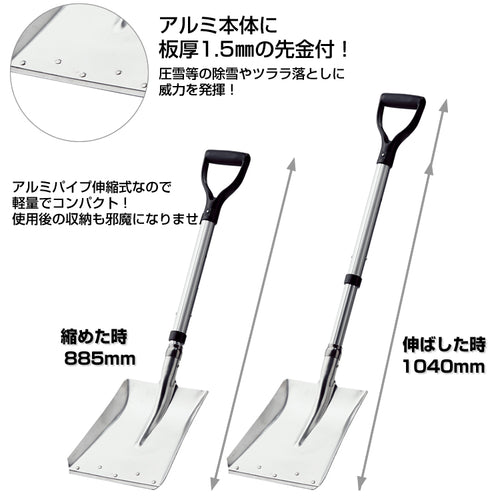 柄が短くなるので車の荷台に積み込みやすい。アルミ本体の先に厚いステンレス板を接合しているので、圧雪の除雪やツララ落としに威力を発揮します。
