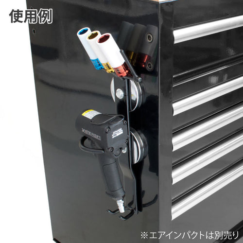 ソケットホルダーにはホイール用インパクトソケットを、リングホルダーにはエアインパクトレンチを、フックにはエアタイヤゲージをかけられます。
