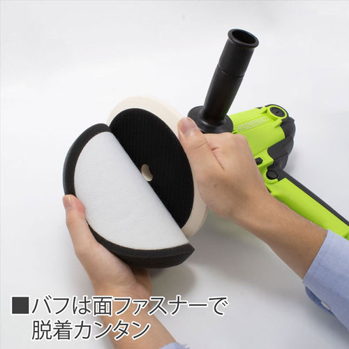 スポンジバフの脱着は面ファスナー式で、コンパウンドの種類や研磨面に合わせ、簡単に交換できます。