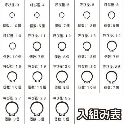 使用頻度の高い18種類のサイズが入った、軸用のスナップリングセットです。