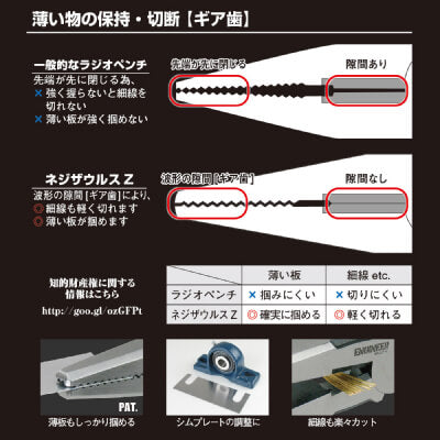 シムプレートなどの薄い物でも、確実につかめる「ギア歯」搭載。(特許)