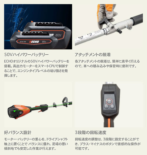 エンジンツールの力強さを受け継ぎ、機動力を進化させたECHO50Vシリーズにバッテリーセレクトアタッチメントシリーズ B-SASが登場。