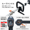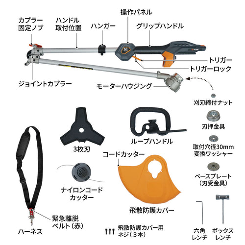 | 付属品 | ハーネス、3枚刃、ナイロンコードカッター、飛散防護カバー、飛散防護カバー用ネジ(3本)、ループハンドル、刈刃締付ナット、刃押金具、取付穴径30mm 変換ワッシャー、ベースプレート(刃受金具)、六角レンチ、ボックスレンチ |