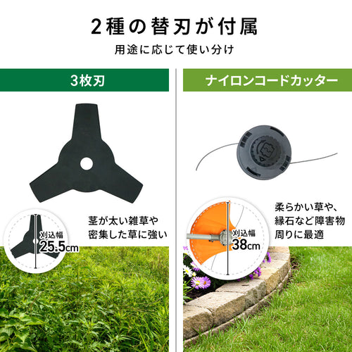 ●付属の3枚刃&ナイロンコードカッターで用途に応じて使い分け可能