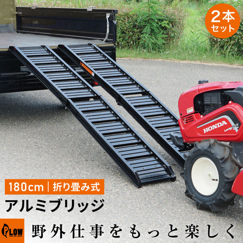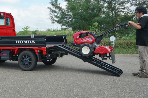 農業機械や二輪車などを軽トラや積載車へ積み込む際に便利な、ショートタイプのアルミ製の折畳式ラダーレールです。