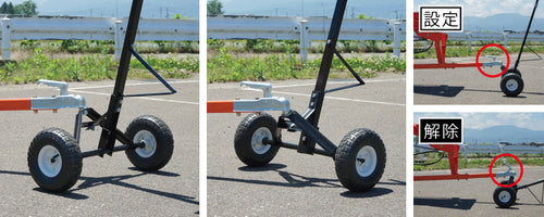 本機と連結させて楽に移動が行える牽引機を標準装備させました。高い移動性能の牽引機は直進性や旋回性に優れ目的地まで容易に到達することができます。また簡単なレバー操作で脱着が行えるので現地到着後すぐに作業が行えます。
