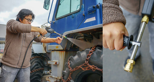 両手でしっかり握れ作業ができるショートガンです。ハンドル部分がネジの役割にもなっていて反時計回りに回転させてる緩みますのでお好みの角度に調節できます。