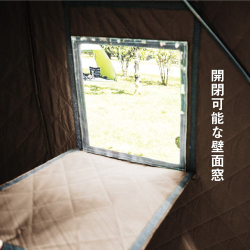 壁面の開口窓はマジックテープ式の遮光布と一体になっていて、カンタンに開閉ができるようになっています。窓を取り外して換気したり、外の景色を楽しみたい時や、より室温の熱を遮断したい時など、状況に応じて使い分けができます。