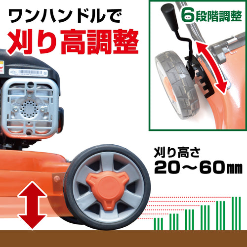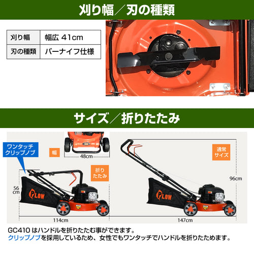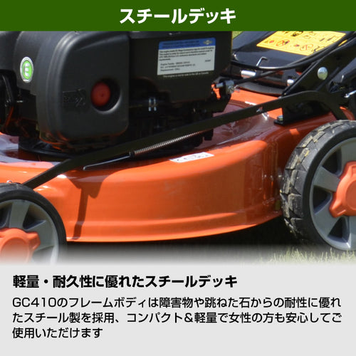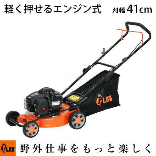 プラウ エンジン芝刈り機 GC410は手押し式です。