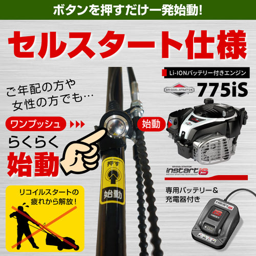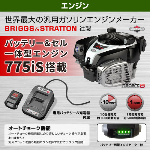 世界最大の汎用ガソリンエンジンメーカー『BRIGGS & STRATTON』社の最新型エンジン『インスタートエンジン775iS』を搭載。バッテリーを小型化する事で、従来別々に積んでいたバッテリーがエンジンと一体化!本体を大型化する事無くセルスタートが可能になりました。また、オートチョーク搭載なので煩わしいチョーク操作は不要です。