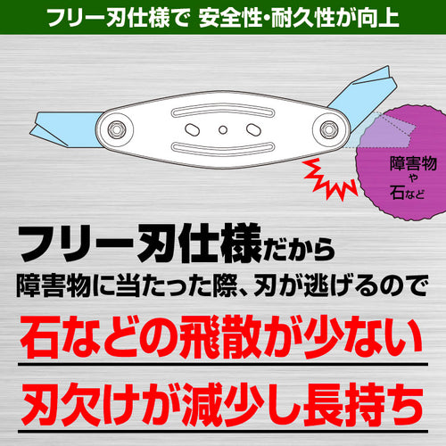 GC480PROではバーナイフに代わりフリーナイフを採用。障害物や石などに刃が当たった際には刃が逃げる事で刃こぼれや芝刈り機本体に伝わる衝撃を受け流しダメージを最小限に抑えます。切れ味はそのままに耐久性と安全性が向上しました。