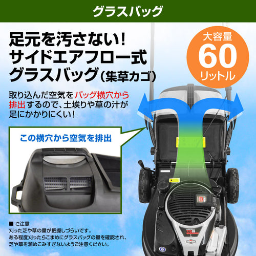 大型のしっかりとした樹脂製グラスバッグを採用。持ち手が付いているので芝を捨てやすく、大容量なので芝を捨てる頻度が少なくて済みます。