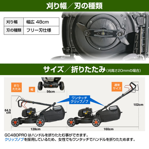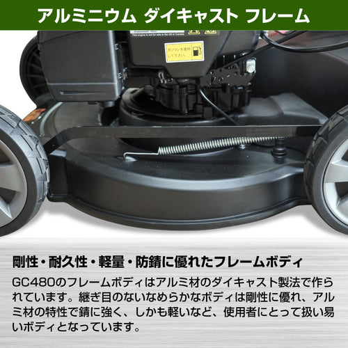 480mmというワイドな刈幅で一気に大量の芝を刈り取ることができ、広い芝地でも快適&スピーディに作業ができます。