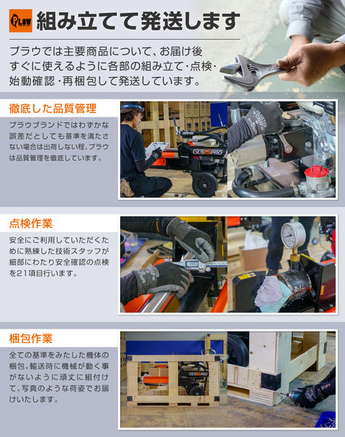 プラウブランドでは定番の薪割り機を復刻!一度は生産終了となったモデルですが、復活を望む多くの声に後押しされ、再び生産を再開しました!GLS15PROといえば、信頼性・排気量ともに高いホンダエンジンGX200。耐久性の高いボディも健在。小型機と感じさせない破砕力を生み出します。高品質なコントロールバルブは安定した油圧コントロールを可能にして、送油量の高い油圧ポンプが7.5秒のサイクルタイムを実現。全体の性能・品質を高めた小型薪割り機の定番として、今もなお薪ストーブユーザーの薪活をサポートしています。