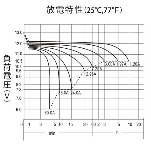 | 定格容量 | 10時間率(1.20A) 12.00AH 5時間率(1.97A) 9.85AH 2時間率(4.20A) 8.40AH 1時間率(7.20A) 7.20AH 0.5時間率(12.96A) 6.46AH |