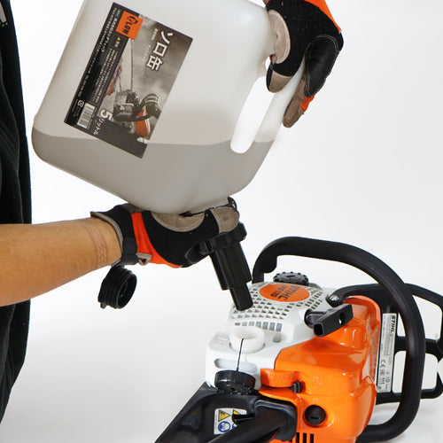 チェンソー本体に注ぎ口を入れて押し込むだけ!