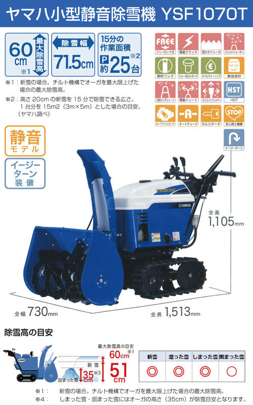 ※2 仕様諸元表に表示したエンジン出力は、回転数3,600rpmでの代表的なエンジンのネット出力値です。除雪機に搭載された状態での実出力値はエンジン回転数、使用環境やその他の条件により変化します。
