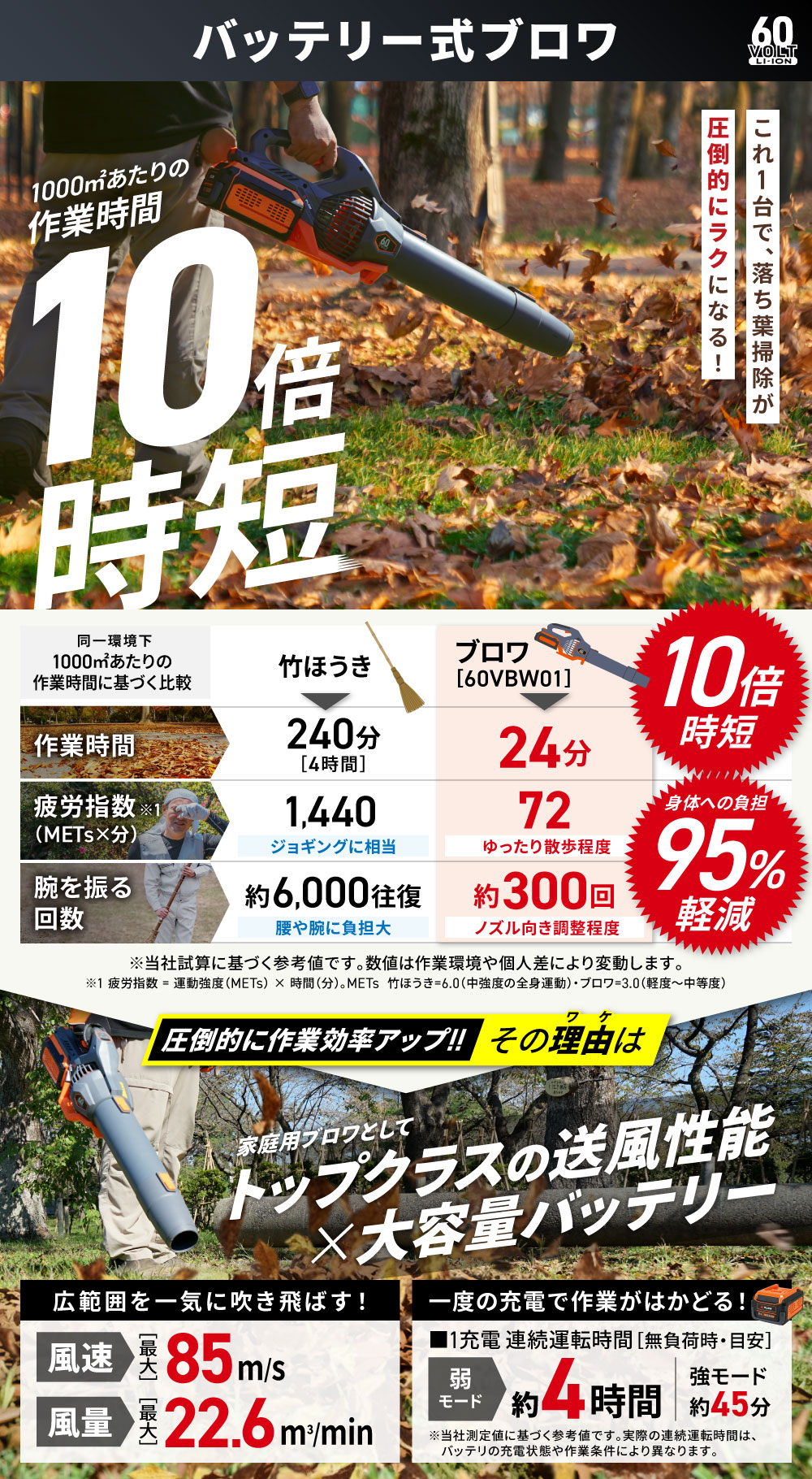 バッテリー式ブロワ 60VBW01|プロ並みの送風性能