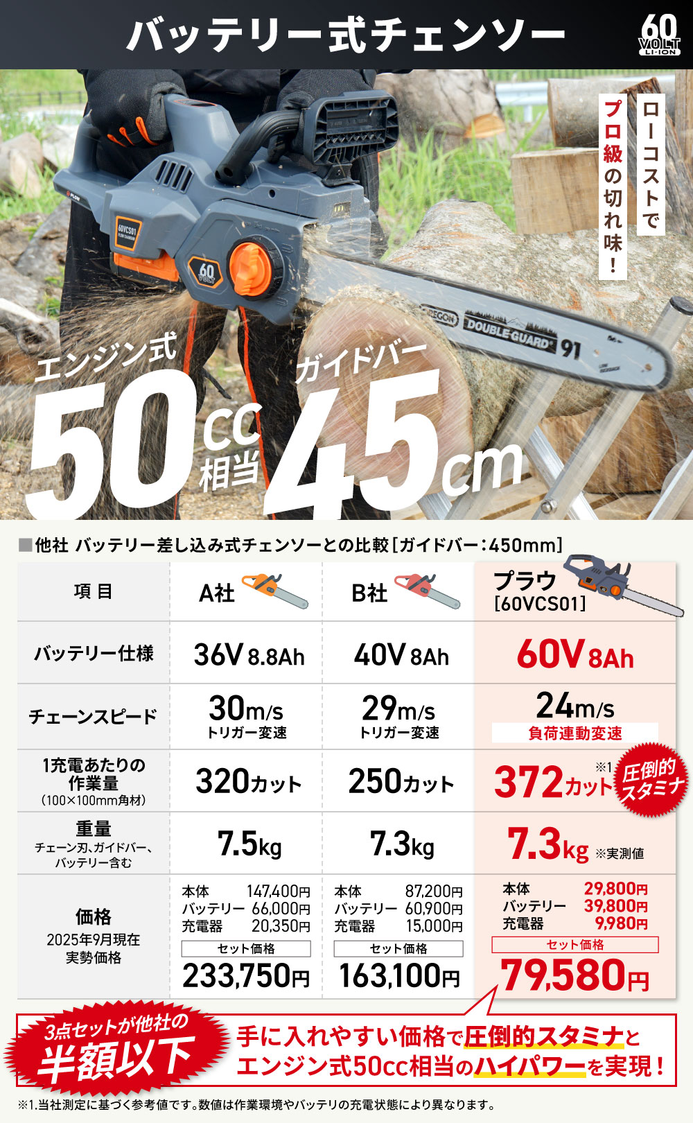 バッテリー式チェンソー 60VCS01|50cc相当のパワー