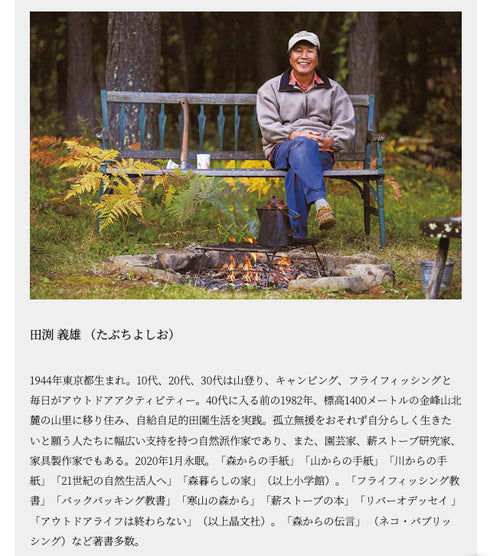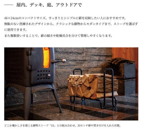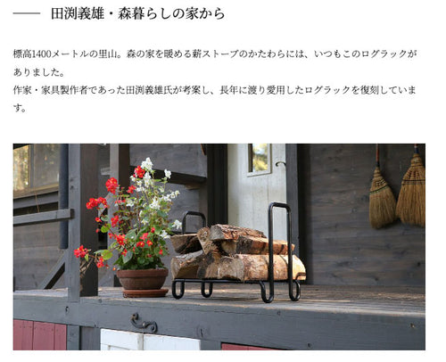 生涯をかけて薪ストーブと向き合い、森暮らしを実践した作家・田渕義雄氏が自らデザイン、愛用したログラックを製品化。 一筆書きのようにシンプルイズベストを体現する無駄のない研ぎ澄まされたフォルムから、 こだわりを貫き、美しく暮らしていた田渕さんの精神を感じることができます。 一晩部屋を暖めるための薪が収まるサイズで、室内以外でも庭、デッキ、テントサウナなど、 薪火を楽しむあらゆるシーンに寄り添います。