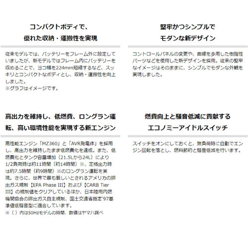 高性能エンジン「MZ360」と「AVR発電体」を採用し、高出力を維持したまま低燃費化を達成。また、低燃費化とタンク容量増加(21.5Lから24L)により1/2負荷時は約11時間(約14時間)※、定格出力時は約7.5時間(約9時間)※のロングラン運転を実現。さらに、世界で最も厳しいとされるアメリカの排出ガス規制【EPA Phase III】および【CARB Tier III】の規制値をクリアしているほか、日本陸用内燃機関協会の排出ガス自主規制、国土交通省指定'97基準値低騒音型に適合しています。