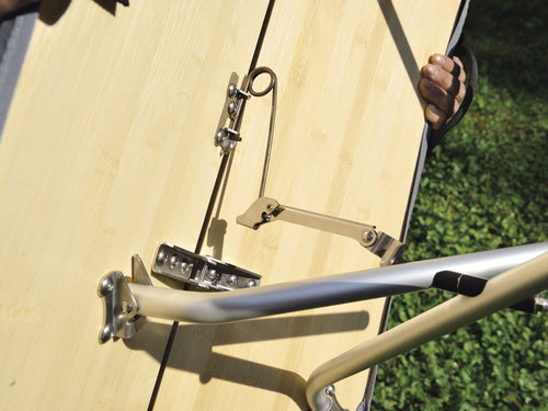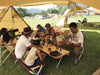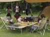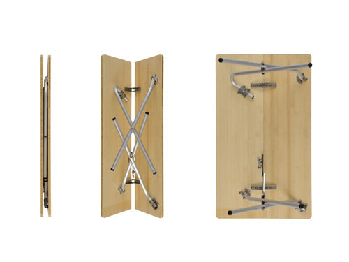 ワンアクションテーブルは、折りたたまれた2枚の天板を開くと内側から飛び出す絵本のように脚部が現れる画期的なシステムのテーブル。簡単でスピーディーなセッティング、撤収が可能。天板は美しく仕上げた竹集成材です。ワンアクションローテーブルの天板の地上高は40cm、LV-091 ローチェア30に座ったときに最適な高さの快適基準寸法です。LV-077RD フォールディングチェア等に最適な地上高66cmのモデルも2つ用意しています。