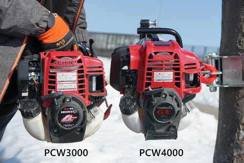 クラッチベアリングはロープかけて、引くとエンジン回転数が上昇してドラムが回る仕組み。牽引と保持がアクセルワークで自在になるので、細かい作業を直感的にこなすことができるようになります。このシステムは遠心クラッチを持たないPCW3000やPCW5000には搭載不可能であり、PCW4000だけが持つ独自システムとなります。