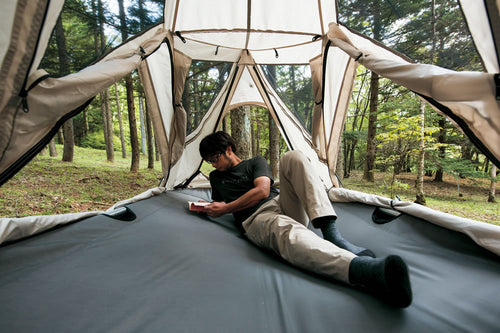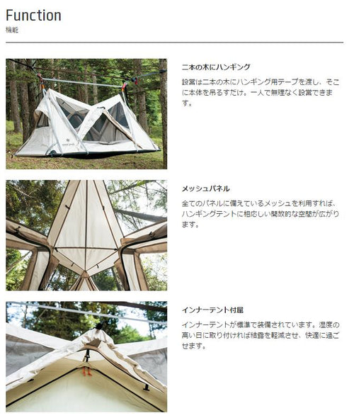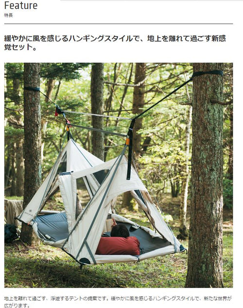 地上を離れて過ごす、浮遊するテントの提案です。緩やかに風を感じるハンギングスタイルで、新たな世界が広がります。