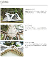 ○ 材質:本体/150Dポリエステルタフタ・PUコーティング耐水圧1,800mmミニマム・テフロン撥水加工・UVカット加工、インナーウォール/68Dポリエステルタフタ、ボトム/600Dポリエステルオックス・PUコーティング、ボトムシート/420Dリップストップナイロン・PUコーティング、ボトムフレーム/ジュラルミンA7001・A6061、ステンレススチール、吊り下げ金具/ステンレススチール